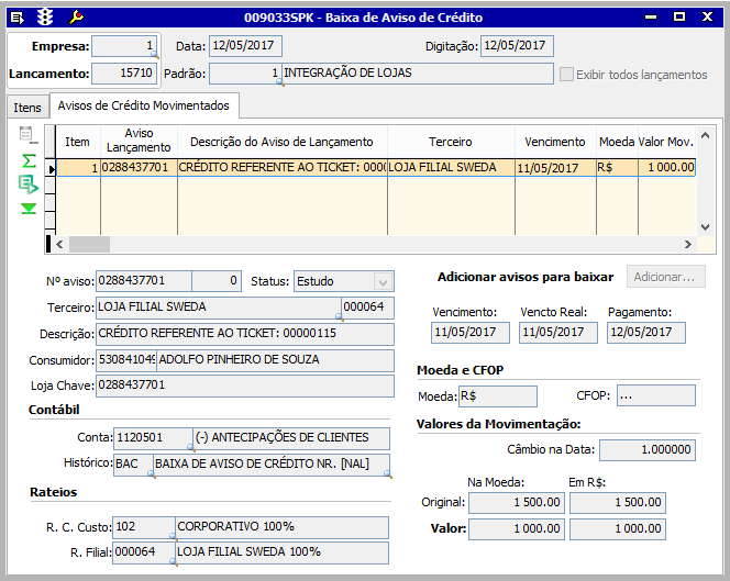 Após salvar a baixa, consulte novamente o aviso de crédito na tela 009020 - Cadastro de Aviso de Crédito e verifique, na guia Avisos de Crédito, que o valor baixado terá sido abatido do campo Saldo.