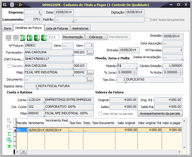 Veja agora o exemplo de um cadastro de título a pagar, respeitando o modelo de hierarquia acima: