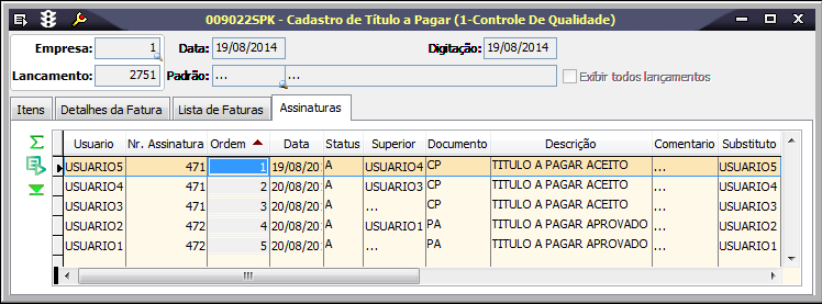 O procedimento deve ser efetuado mesmo para aqueles usuários que não tenham permissão para realizar a aprovação, ou seja, que apenas cadastram e assinam os documentos do contas a pagar. Ou seja, se um determinado usuário cadastrar uma nota fiscal, mas não estiver configurado na hierarquia, a nota fiscal não será salva (no caso de título a pagar gerado por integração pela entrada da nota fiscal).