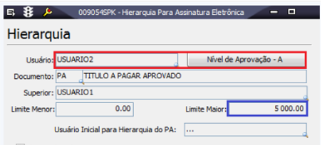 Este usuário será considerado na hierarquia com o controle de alçada para assinatura de documentos até 5.000,00.
