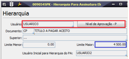Este usuário será considerado na hierarquia com o controle de alçada para assinatura de documentos até 4.500,00.