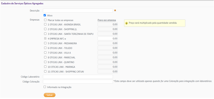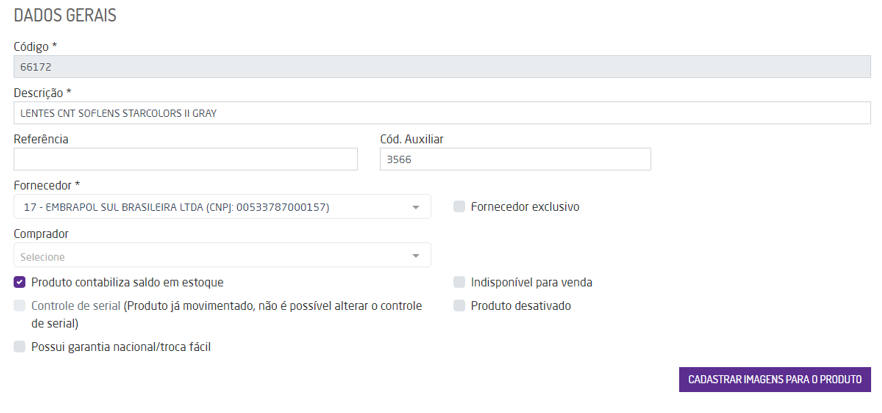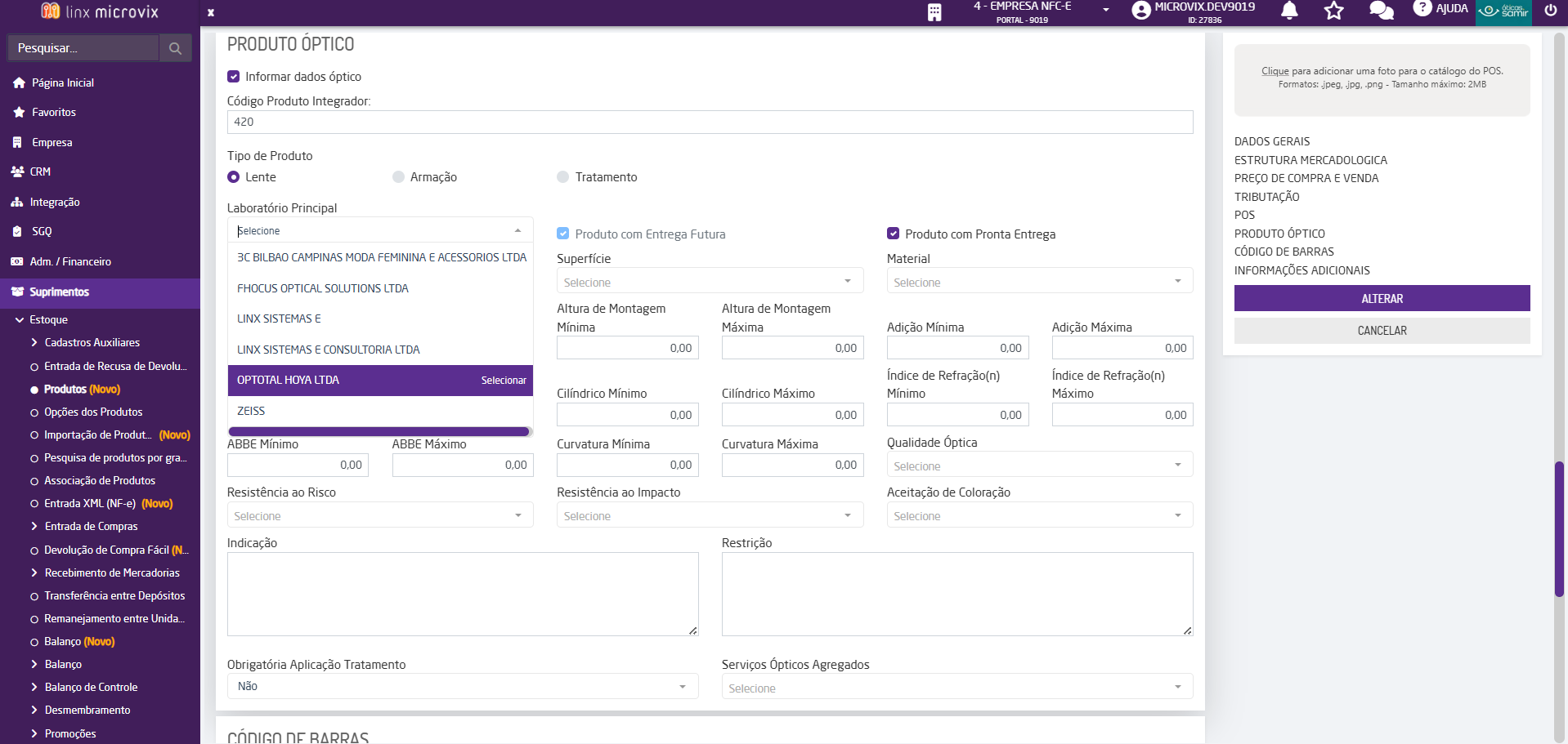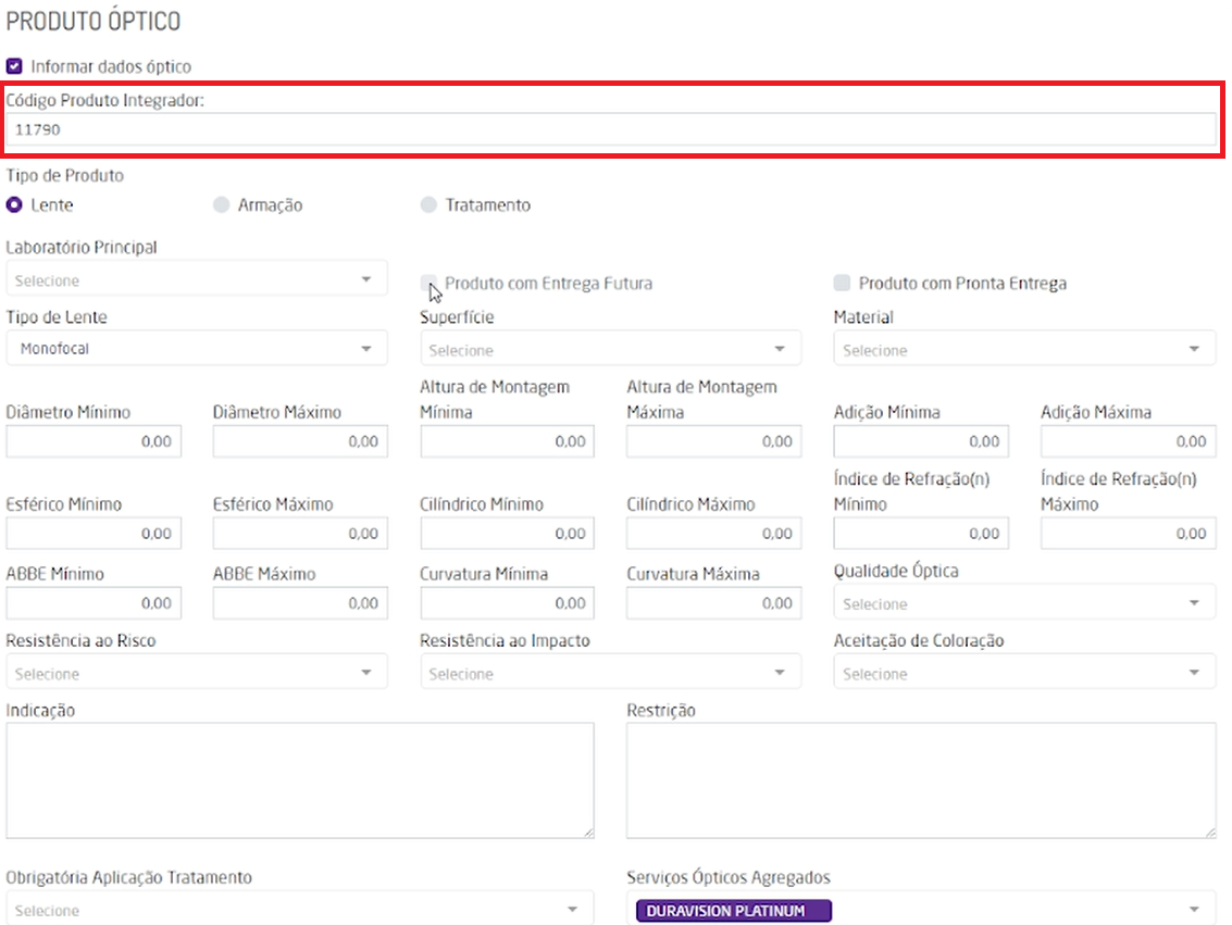 - Para as lentes é necessário adicionar o código no cadastro do produto. Já para serviços pode ser usado o cadastro de tratamentos ou serviços ópticos.