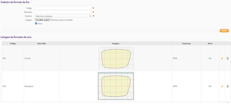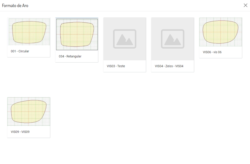 No cadastro de formato de aro é possível adicionar uma imagem relacionada ao formato. Ao adicionar o formato de aro na receita, na tela é mostrado o nome e a imagem vinculada com aquele formato.