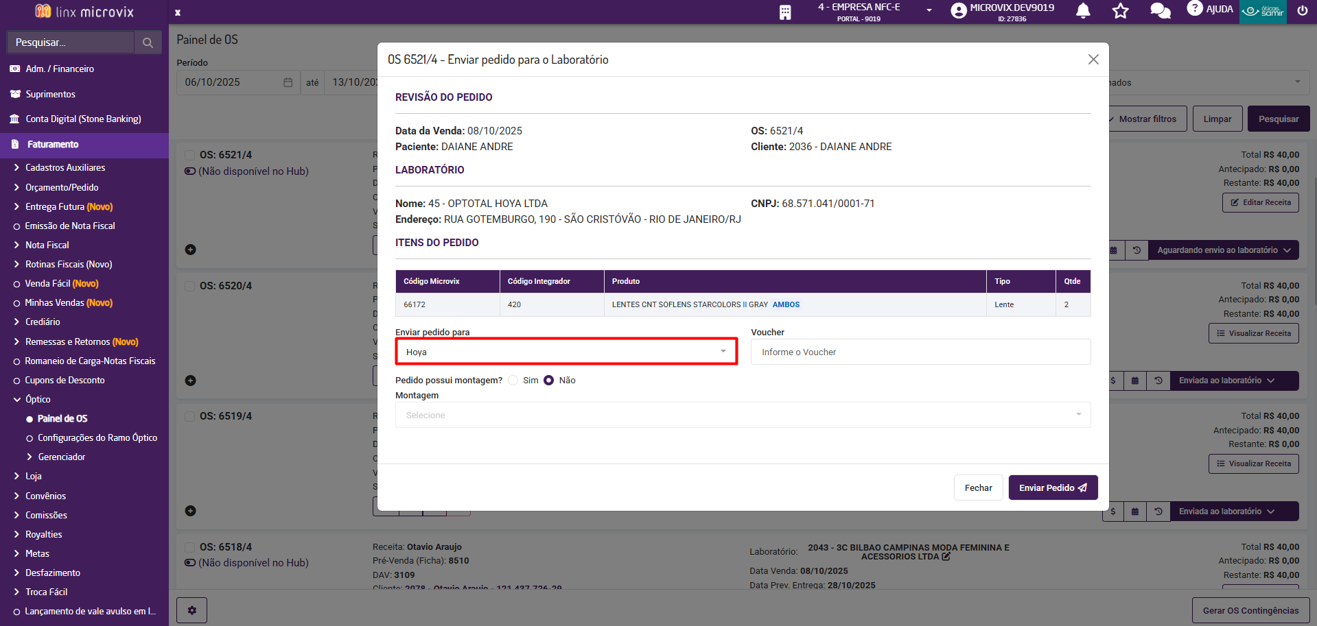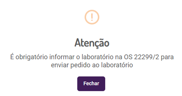 Após todas as configurações realizadas e a Ordem de Serviço gerada no sistema, o envio do pedido para o laboratório é realizado através do Painel de OS. Para realizar o envio do pedido é necessário informar o laboratório, caso não seja informado, o sistema irá emitir um alerta informando a obrigatoriedade.