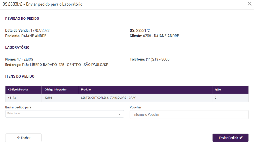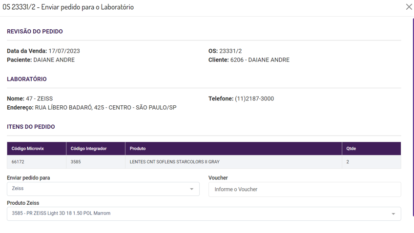 Na tela de revisão de envio de pedido, são exibidos alguns dados como cliente, paciente, laboratório, itens, entre outros. No campo “Enviar pedido para”, ao selecionar Zeiss irá aparecer a listagem de Produto Zeiss que fazem parte do mesmo grupo do código da lente do cadastro do produto.