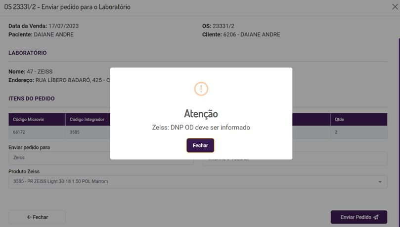 Ao clicar em Enviar Pedido, o sistema Linx irá realizar a conexão com o laboratório para enviar o pedido e após isso mostrar ao usuário o retorno do laboratório com o número do pedido ou, se tiver alguma informação errada, o que é necessário corrigir para realizar o pedido.
