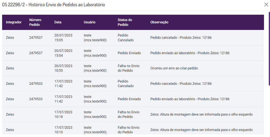 Todas as interações entre o sistema Linx e o laboratório ficam salvos no histórico da Ordem de Serviço, que pode ser consultado a qualquer momento.