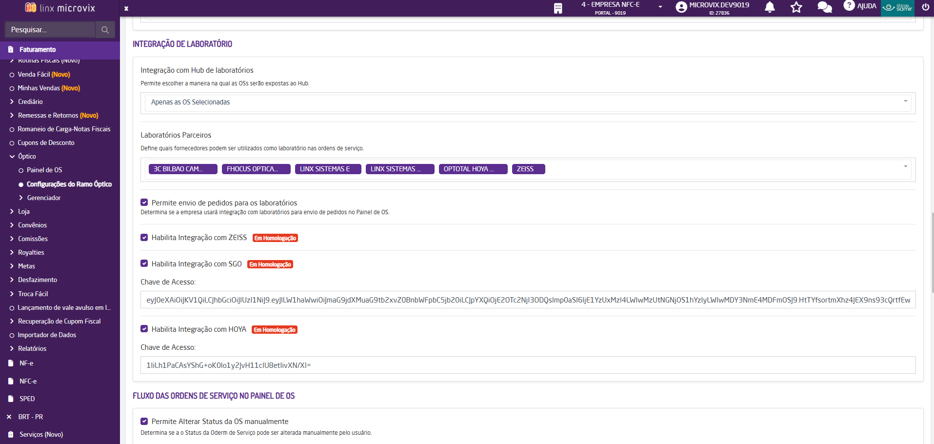 - Para utilizar a integração com laboratório, nas Configurações do Ramo Óptico é necessário habilitar a opção “Permite envio de pedidos para os laboratórios” e selecionar os laboratórios que deseja realizar a integração.