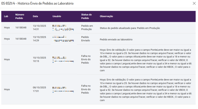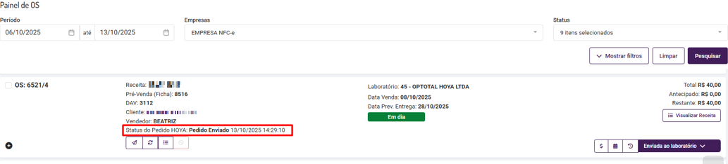 Ao acessar a tela de atualização de status do pedido e visualização do histórico, também é possível realizar a integração com o laboratório Hoya com essas funcionalidades.