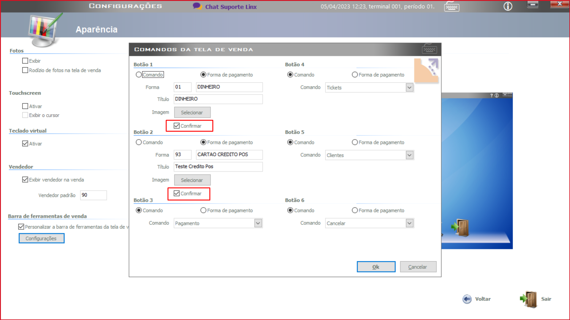 Para habilitar a apresentação da janela de confirmação, na tela Configurações de Aparência, foram incluídas as caixas de verificação "Confirma" para cada forma de pagamento exibida como comando na tela venda.
