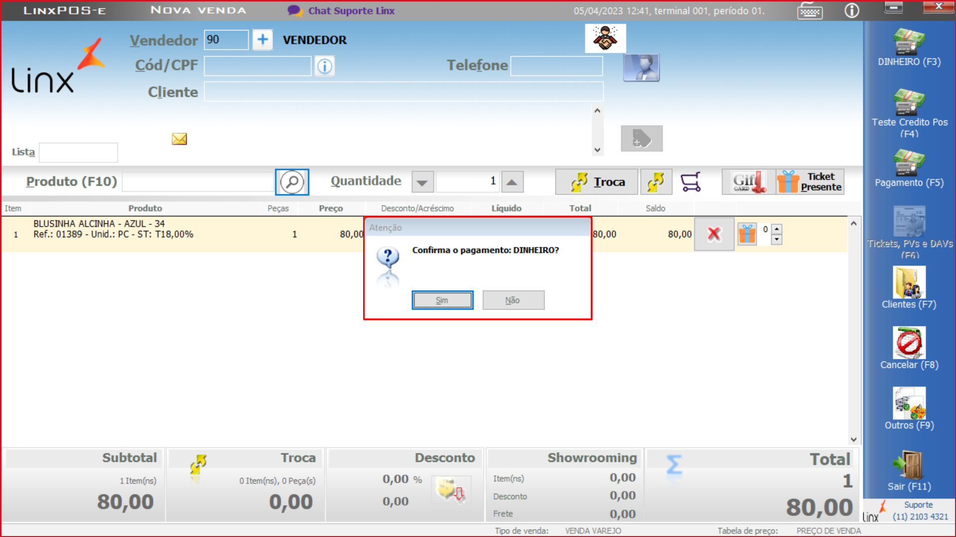 4. Ao acessar a tela de vendas e selecionar um botão referente à forma de pagamento cuja confirmação foi habilitada, será exibida uma janela de atenção. Clique em Sim para manter a forma de pagamento selecionada ou em Não se desejar modificá-la.