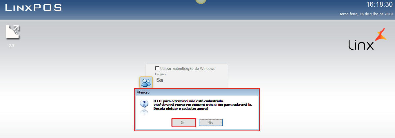 4.   Uma vez reiniciado, será apresentada a mensagem a seguir. Clique na opção Sim, para efetuar o cadastro do TEF neste terminal.
