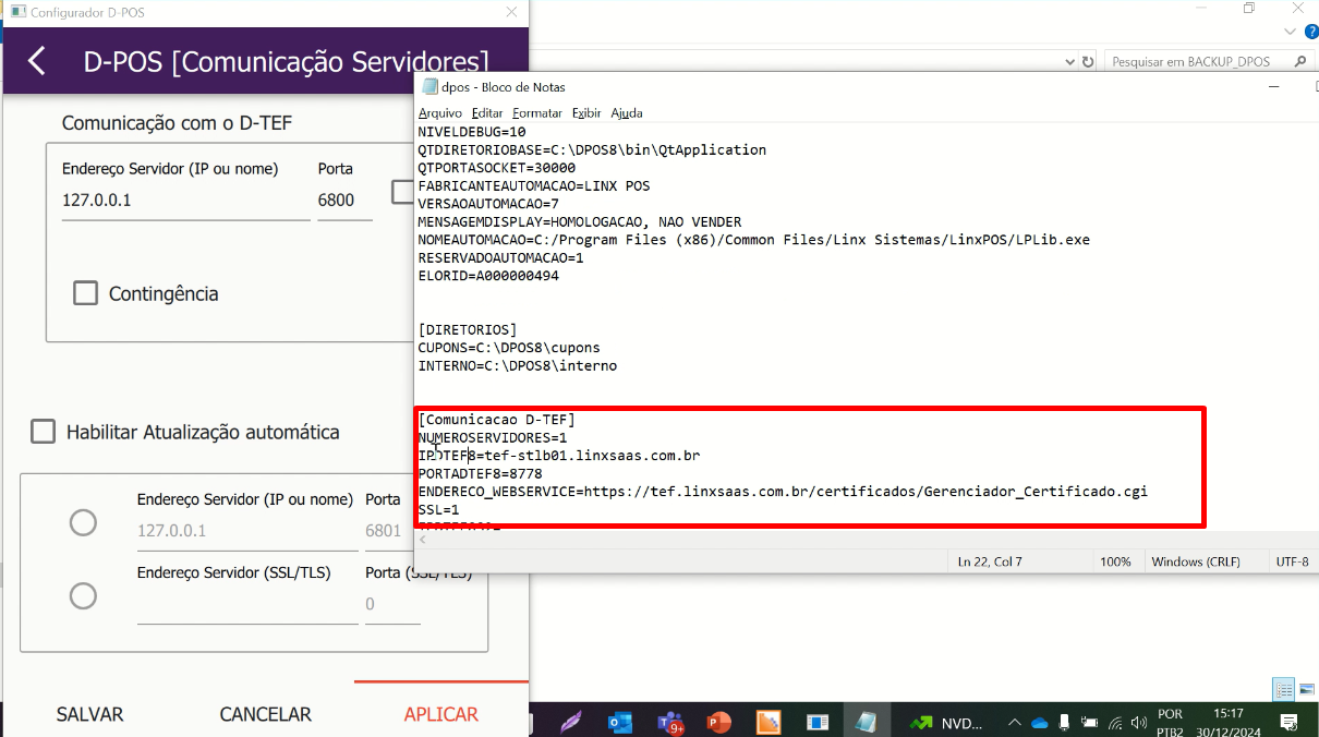 Caso utilize o produto Linx D-TEF e esteja atualizando para o Linx POS 7.10 SPK 29, realize o backup do arquivo DPOS.ini localizado no Diretório C:\Windows