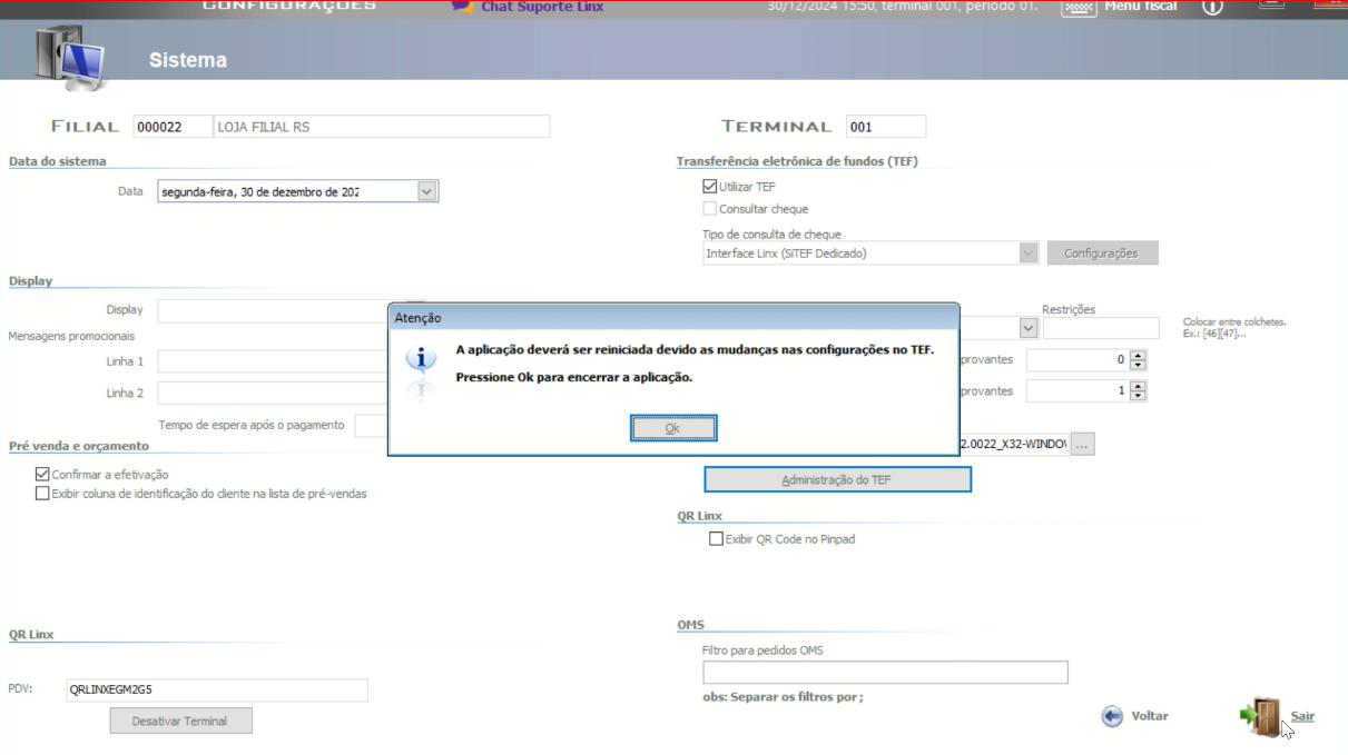 - Após todas as configurações realizadas, o sistema exibirá a mensagem abaixo e na sequência será encerrado para validação das configurações.