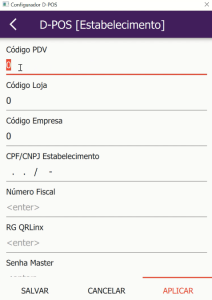 - Acesse o menu Estabelecimento e preencha as informações Código PDV, Código Loja, Código Empresa e CPF/CNPJ Estabelecimento.