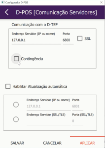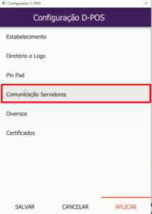 Configure o Endereço Servidor(IP ou nome), Porta e SSL e clique em Aplicar.- Utilize o arquivo DPOS.INI (Vide o PASSO 1), na configuração do menu "Comunicação Servidores" utilizando os campos abaixo: