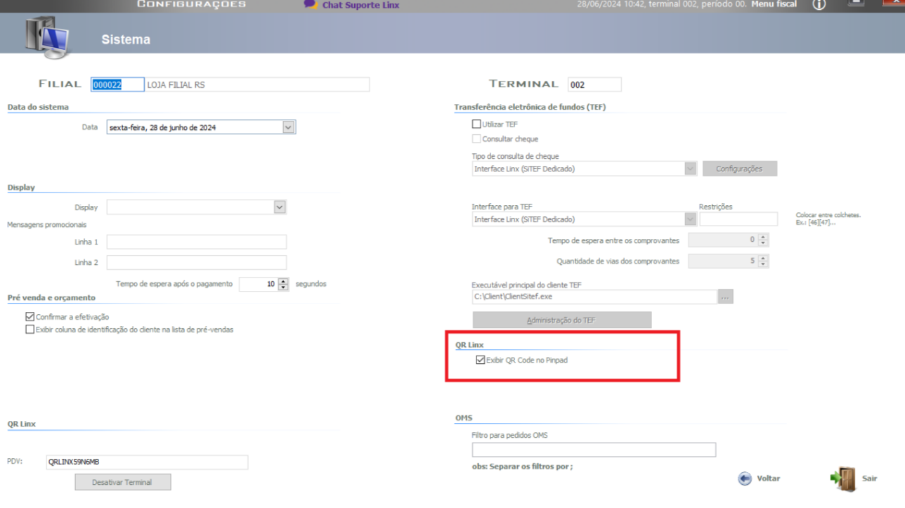 - QR Linx Integrado → QR Linx | Habilita QR Linx habilitado;