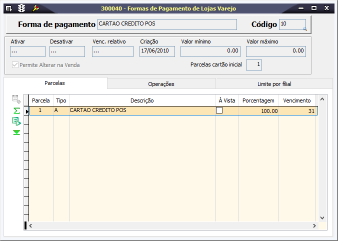 As lojas precisam ter configurado no mínimo uma forma de Pagamento utilizando o Tipo pagamento "A" (cartão de crédito POS).