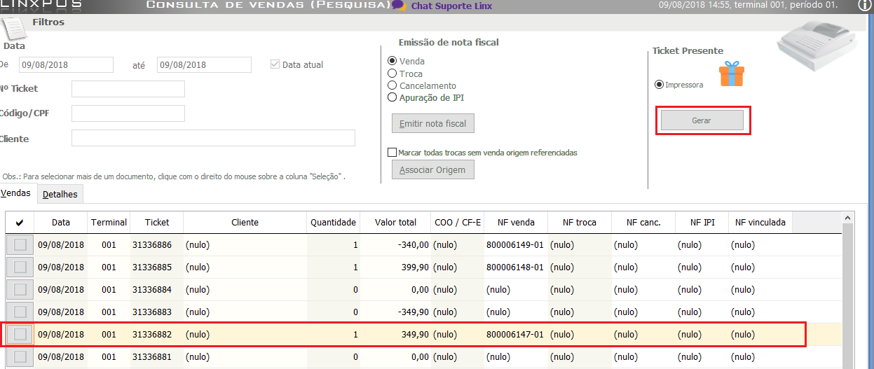 - Selecione a venda que deseja imprimir o ticket presente. Em seguida, pressione o botão Gerar para imprimir o ticket presente.