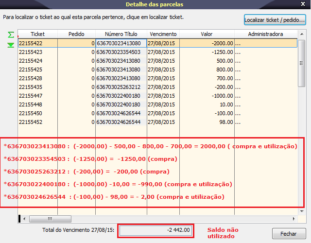 Em seguida verifique na página Parcelas do Resumo o detalhe dos gifts vendidos e utilizados na loja.