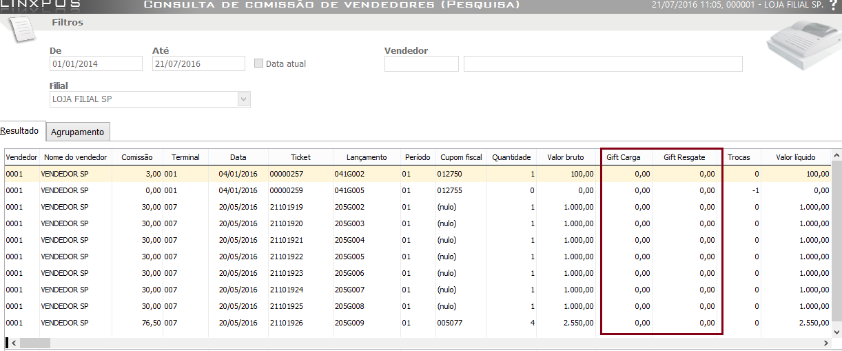 No Linx POS Manager está disponível o relatório Venda de vendedores com GiftCard que exibe as comissões de carga e de resgate do Gift Card .