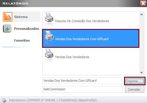 5. Então, escolha o relatório Vendas dos vendedores com Gift Card e clique em imprimir.