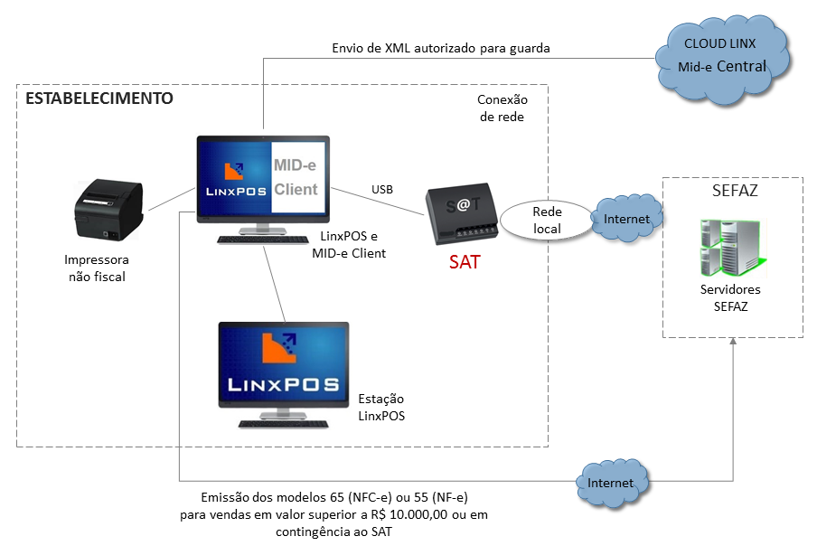 - O equipamento SAT deve ser fisicamente conectado a um servidor com MID-e Client e Linx POS em uma porta USB (consulte os pré-requisitos citados mais adiante).