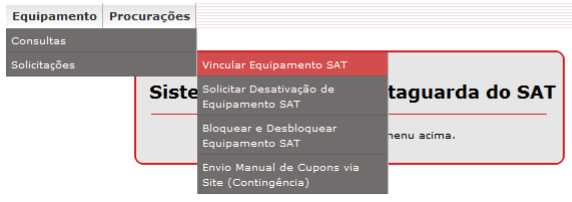 6. Clique no menu Equipamento e então na opção Solicitações / Vincular Equipamento SAT: