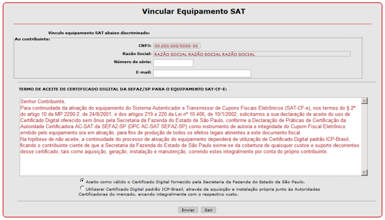 Antes de instalar e configurar o equipamento SAT adquirido, será necessário vinculá-lo, na SEFAZ, ao CNPJ do estabelecimento em que ele será utilizado. Consulte os modelos homologados no tópico Pré-requisitos.
