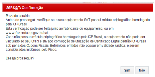 9. Caso a opção marcada tenha sido "Utilizarei Certificado Digital padrão ICP-Brasil, através de aquisição e instalação própria junto às Autoridades Certificadoras do mercado, arcando integralmente com o respectivo custo.", será exibida a seguinte mensagem antes do próximo passo. Leia e clique em Sim para prosseguir; ao clicar em Não será exibida a tela inicial do sistema.