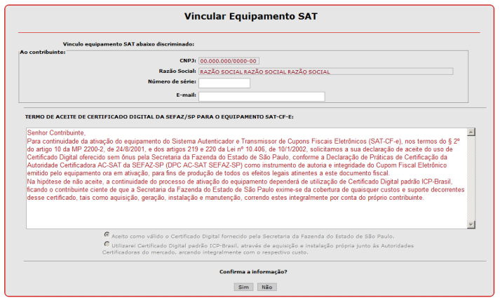 7. Em seguida informe o número de série do equipamento SAT a ser vinculado e o e-mail da empresa. O número de série é fornecido pelo fabricante e possui 11 dígitos, incluindo 2 dígitos verificadores. Em geral pode ser localizado em etiqueta anexa ao equipamento.