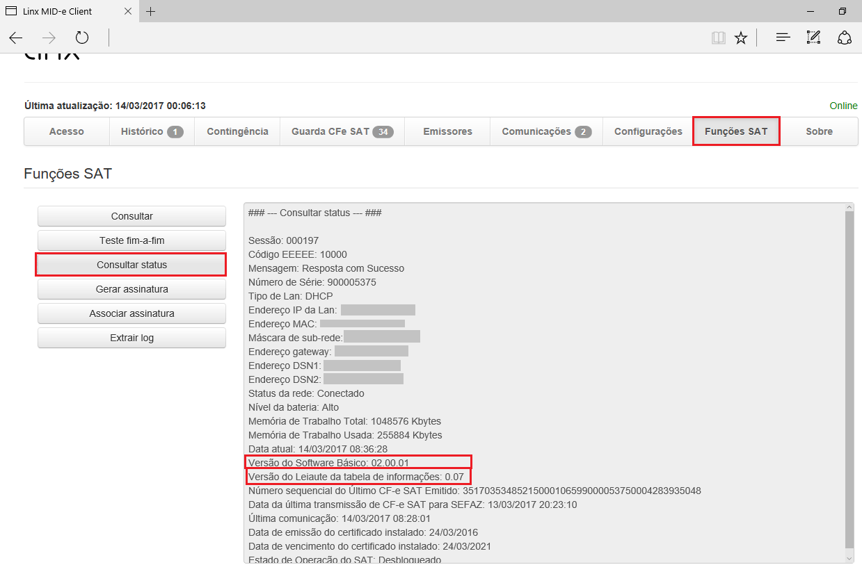 Após a atualização do software básico, a versão do leiaute e a versão do software podem ser consultadas no MID-e Client, em Funções SAT, opção Consultar status.