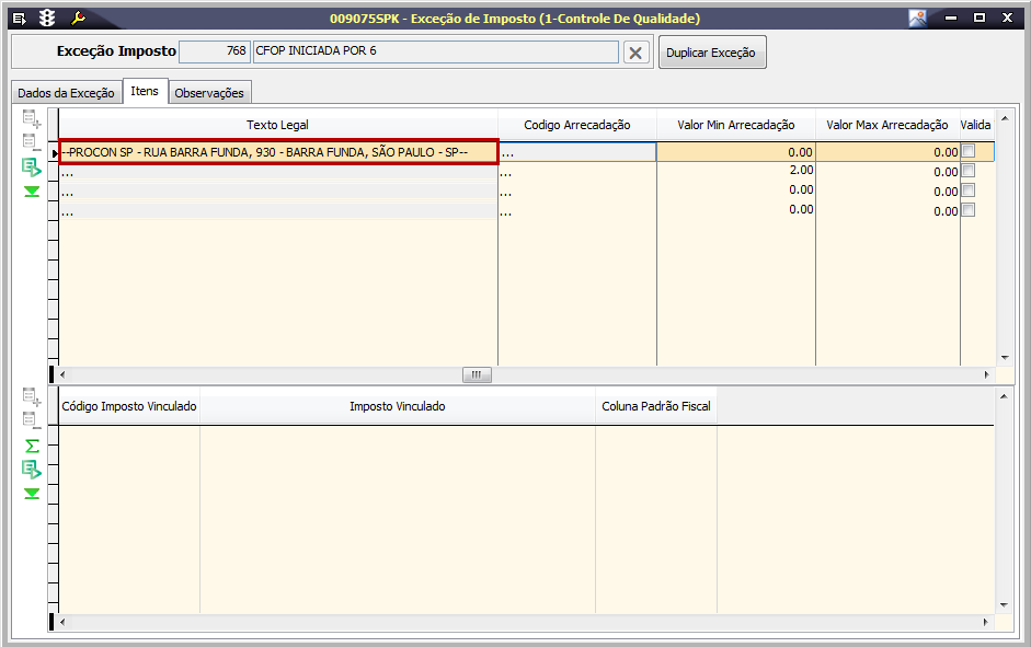 Para adicionar quebra de linha antes e/ou depois do Texto Legal, impresso no CF-e-SAT, basta inserir os caracteres "--" antes ou depois da configuração do texto, na tela 009075 - Exceção de Imposto.