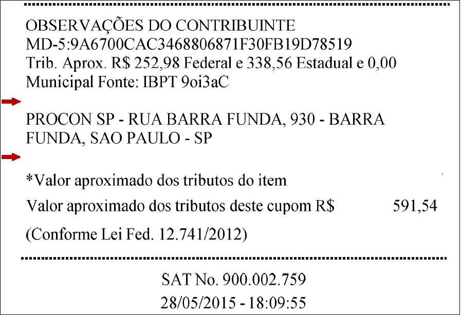 O efeito de uma ou mais quebras de linha terá efeito no CF-e-SAT na área indicada abaixo, antes e/ou depois do Texto Legal configurado: