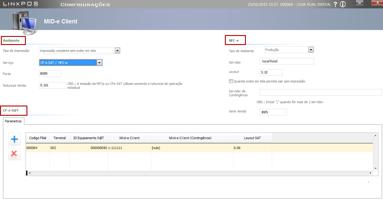 No Linx POS Manager, módulo Configurações/MID-e Client, configure os campos das seções Ambiente, NFC-e (somente para ambientes que emitam também esse tipo de documento), e CF-e-SAT. Veja a descrição dos principais campos logo abaixo.