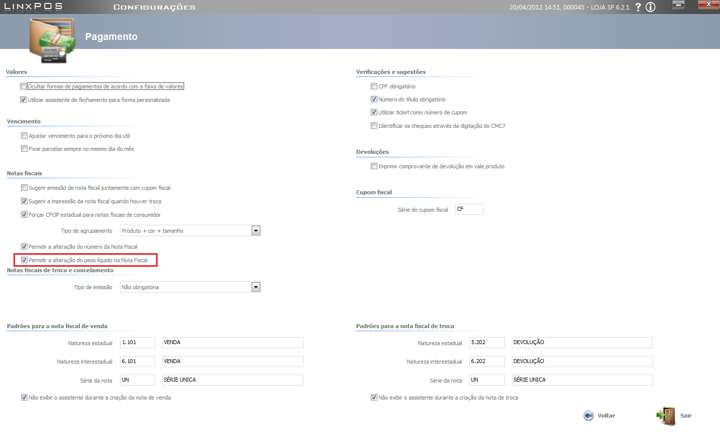 4. Selecione o checkbox "Permitir a alteração do peso líquido na nota.":
