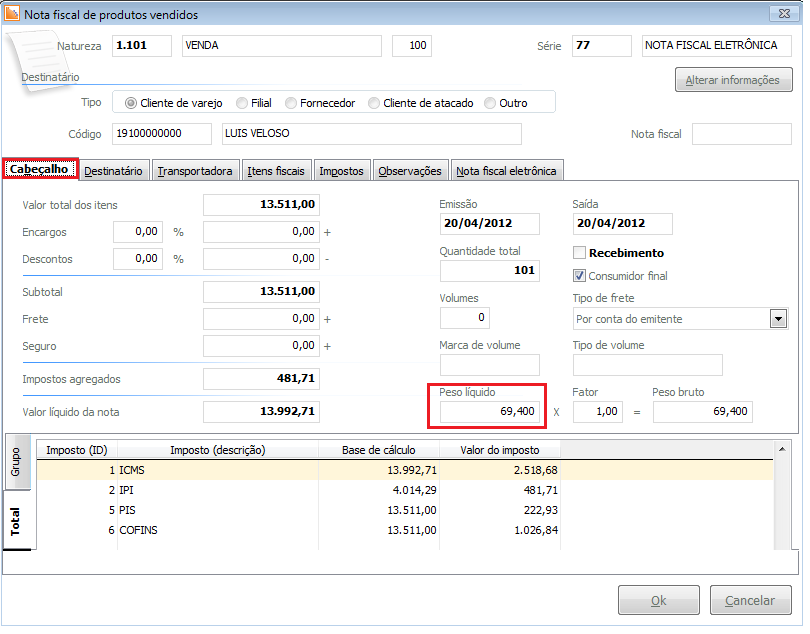 Ao emitir uma nota fiscal de venda, saída ou entrada, é possível preencher o campo Peso Líquido do produto, para que os dados do item seja mencionado nas notas.