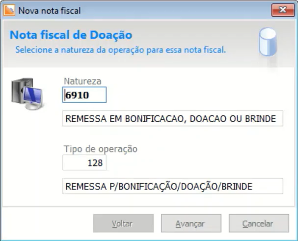 - Será exibida a tela Nota Fiscal de Doação para seleção da informação de Natureza da Operação.