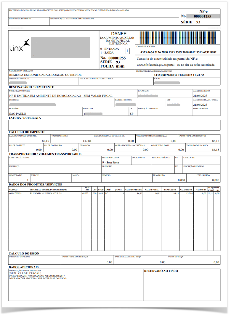 II. A Nota Fiscal referente à remessa, a título de doação, deverá ser emitida no momento da saída da mercadoria do estabelecimento do doador com o devido destaque do imposto, devendo indicar obrigatoriamente o nome, CPF e endereço do destinatário.