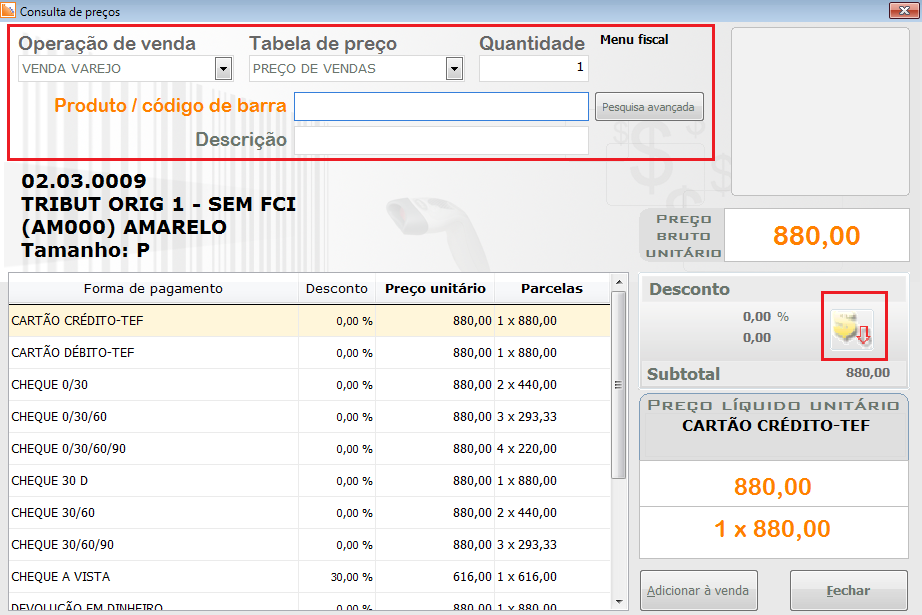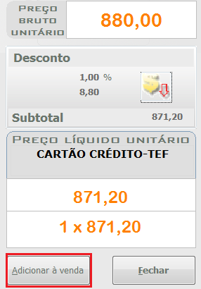 O desconto na forma de pagamento também é apresentado na área inferior da tela, e pode ser alterado pelo gerente da loja.