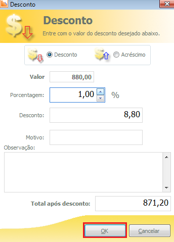 6. Informe e clique em Ok, para que haja desconto na venda.
