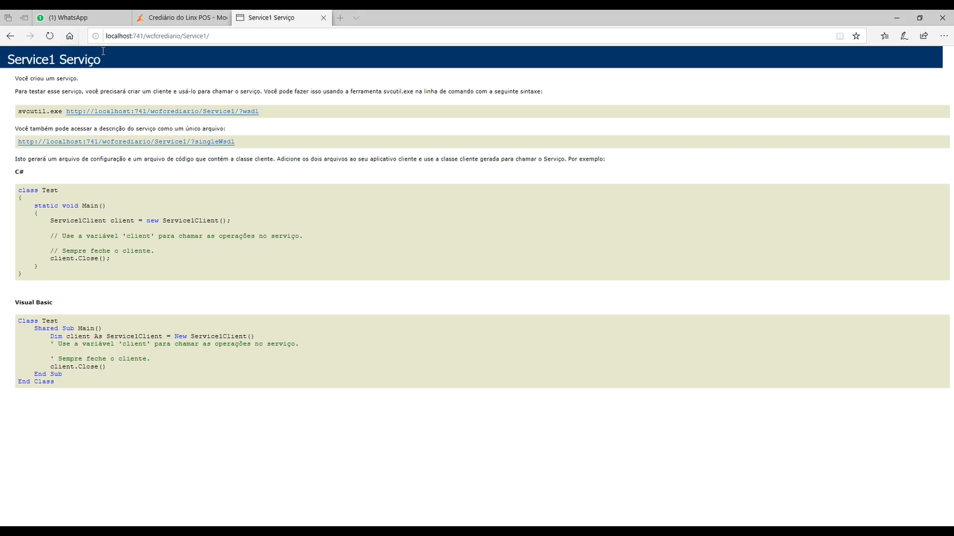 6. Por fim, teste a resposta do serviço por meio do endereço http//localhost:741/wcfcrediario/Service1/ , jogando o link no browser.