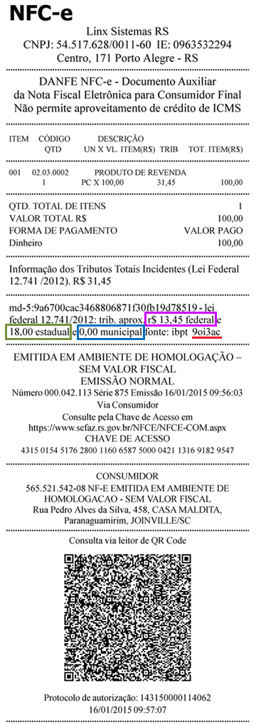 A NFC-e exibe, além do valor dos tributos separadamente por ente federativo, a informação sobre os tributos totais. Essa duplicidade se deve à obrigatoriedade de envio também da informação do valor total no XML da nota.