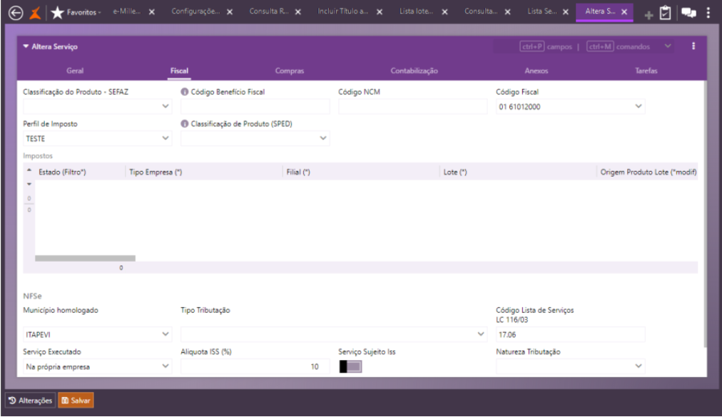 Em Produtos e Serviços > Serviços, é preciso ter serviços cadastrados no sistema. Faça a busca, selecione o serviço, dê um duplo clique sobre ele ou clique no botão Altera Serviço, configurar:
