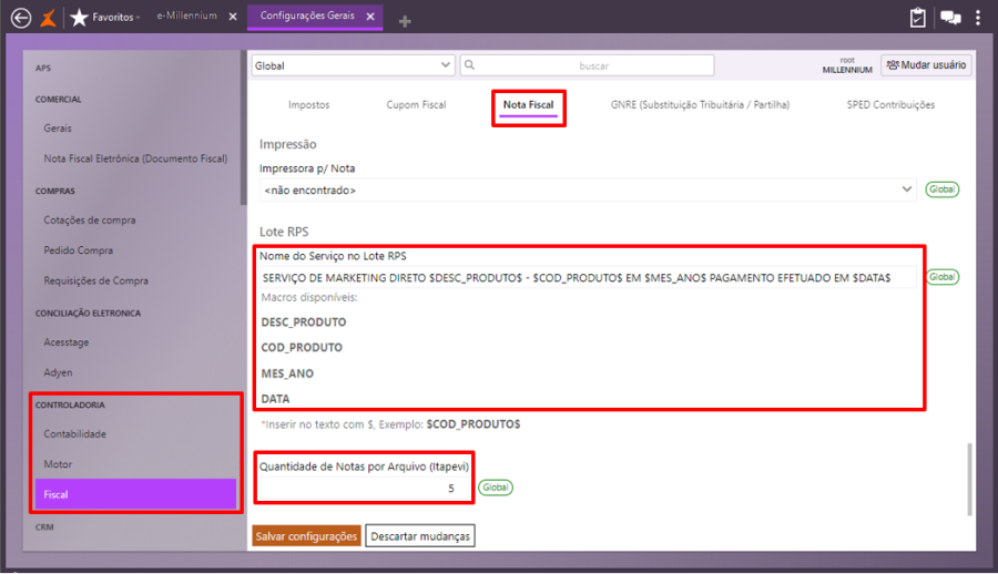 Obs.: há quatro opções de macros disponíveis para incluir no nome do serviço: DESC_PRODUTO, COD_PRODUTO, MÊS_ANO e DATA. Basta inserir no texto entre cifrões. Exemplo: $COD_PRODUTO$.