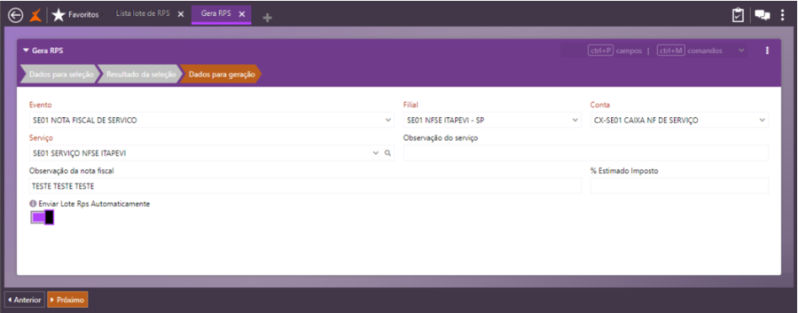 - Ligar o parâmetro Enviar Lote RPS Automaticamente;