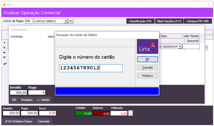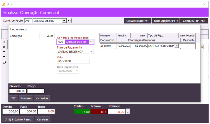 O sistema bloqueará a finalização da venda, caso o operador tente emitir a nota fiscal sem acessar o TEF para registrar a utilização do cartão.