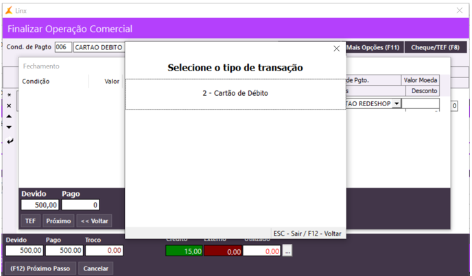 Na tela de finalização, localize o botão ao lado da condição de pagamento, para abrir a janela do TEF: