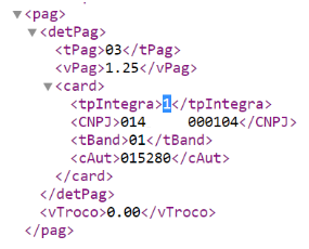 - Abra o arquivo e localize a tag tpIntegra, que deverá estar preenchida com valor 1, indicando que a venda foi realizada com a utilização do TEF.