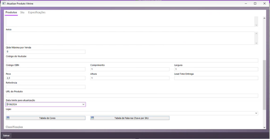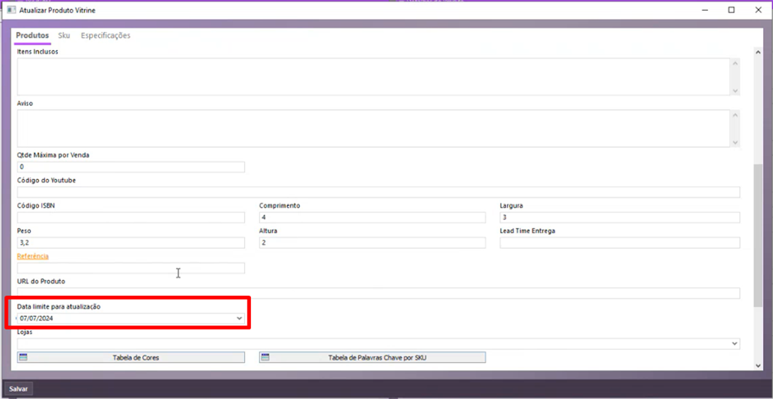 Em Produtos e Serviços > Vitrines > Vitrine de Produtos, o campo Data Limite para Atualização, deverá estar preenchido: